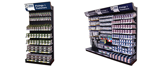 Merchandisers can be provided to display a variety of stock including rolls of fencing, buckets of nails, boxes of screws and euroslotted bags of bolts and fixings.
